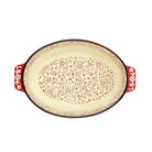 ارتقي بتجربة التقديم مع هذا الطاجن المصنوع من البورسلين عالي الجودة، بتصميم فلكلوري مستوحى من الزخارف النباتية الكلاسيكية. يبرز الطاجن بجمال التباين بين اللون الأحمر الدافئ والزخارف البيضاء الدقيقة من الخارج، في تناغم مثالي مع الداخل العاجي المزيّن بنقوش يدوية الطابع بدرجات الأحمر.