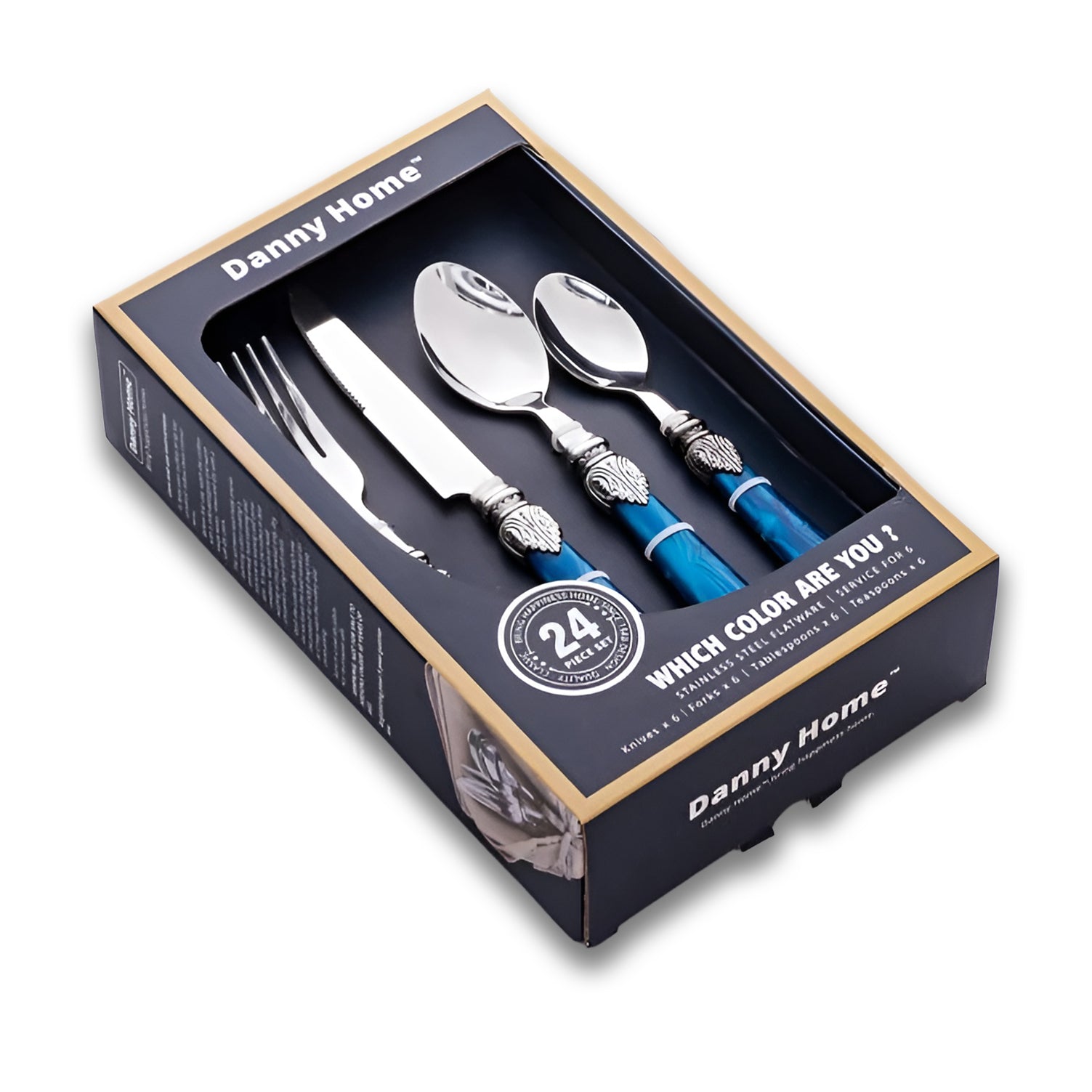 - مجموعة مكونة من 24 قطعة مصنوعة من الفولاذ المقاوم للصدأ بمقابض ذات تصميم رخامي بلاستيكي.