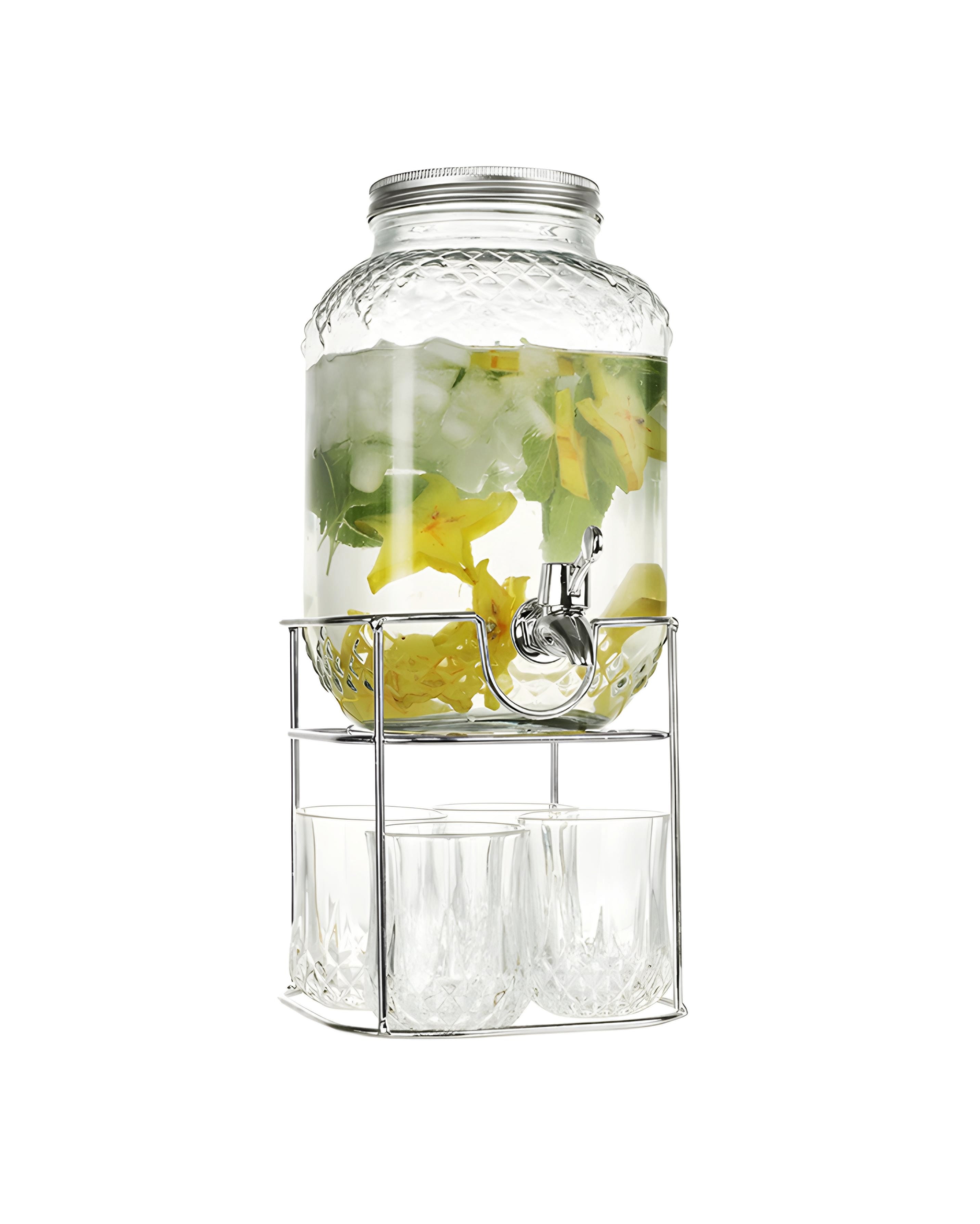 طقم موزع مشروبات زجاجي مع 4 أكواب، مثالي لتقديم العصائر والمشروبات الباردة في المنزل أو المناسبات.