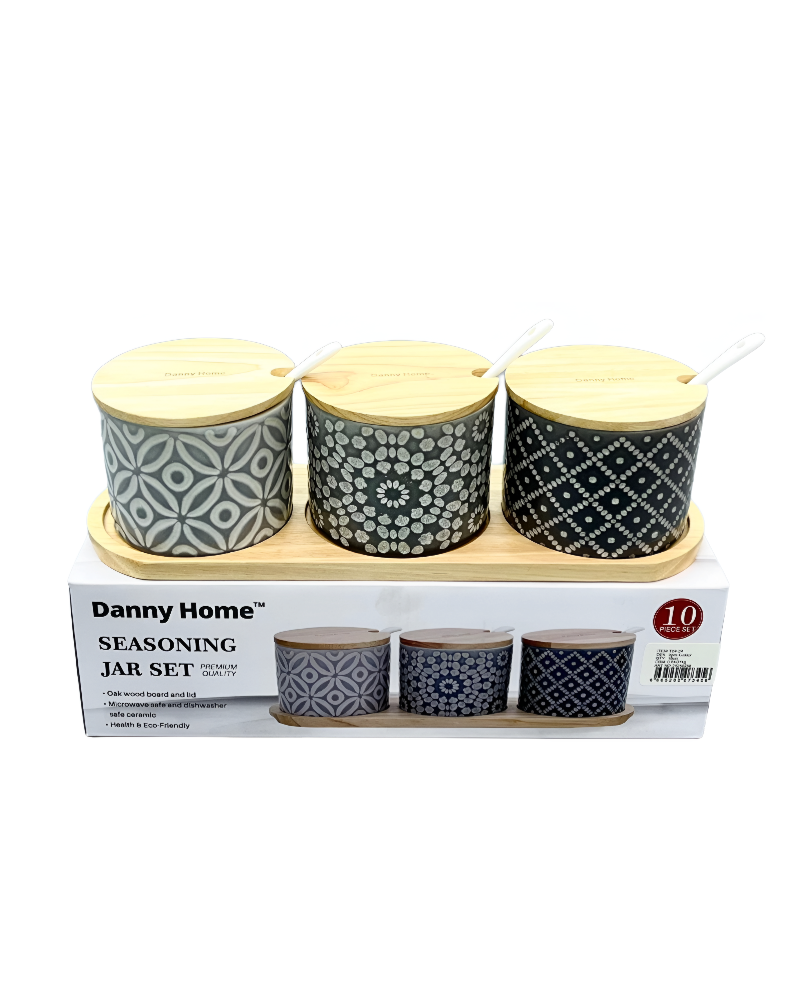 طقم توابل بورسلين 3 قطع مع قاعدة خشب أنيقة لإضافة لمسة عصرية لمطبخك.