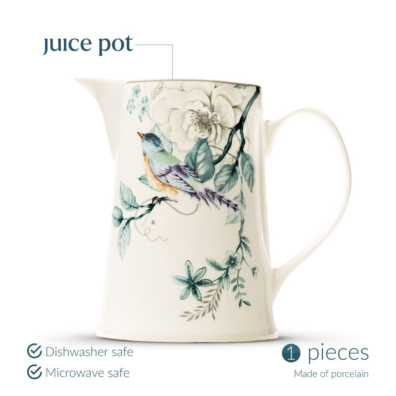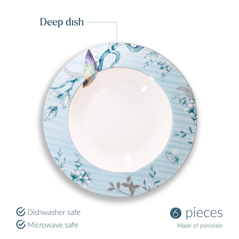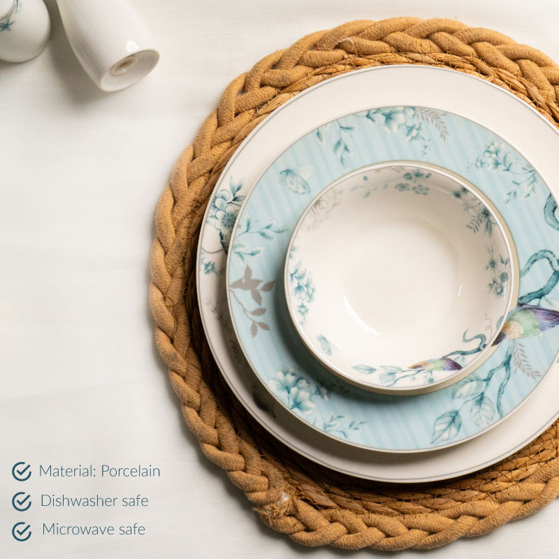 ٣٨ قطعة بتصميم هادئ مستوحى من الطبيعة، يجمع بين التفاصيل الرقيقة واللمسات الفنية الراقية، مصنوع من خامات البورسلين الفاخرة، وآمن للاستخدام في غسالة الأطباق والميكروويف، ليمنحك تجربة يومية تنبض بالأناق