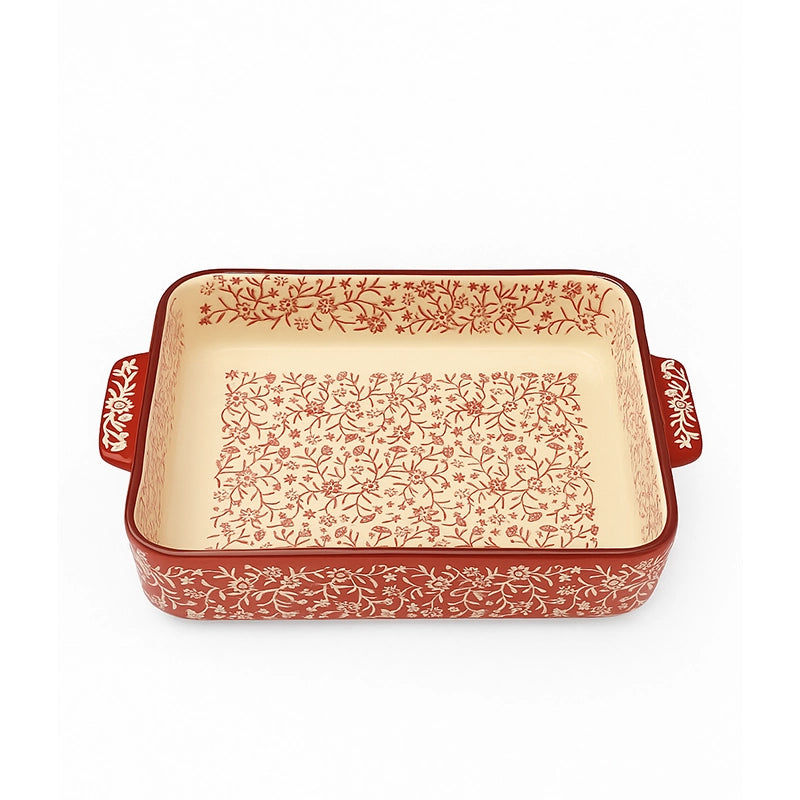 ارتقي بتجربة التقديم مع هذا الطاجن المصنوع من البورسلين عالي الجودة، بتصميم فلكلوري مستوحى من الزخارف النباتية الكلاسيكية. يبرز الطاجن بجمال التباين بين اللون الأحمر الدافئ والزخارف البيضاء الدقيقة من الخارج، في تناغم مثالي مع الداخل العاجي المزيّن بنقوش يدوية الطابع بدرجات الأحمر.